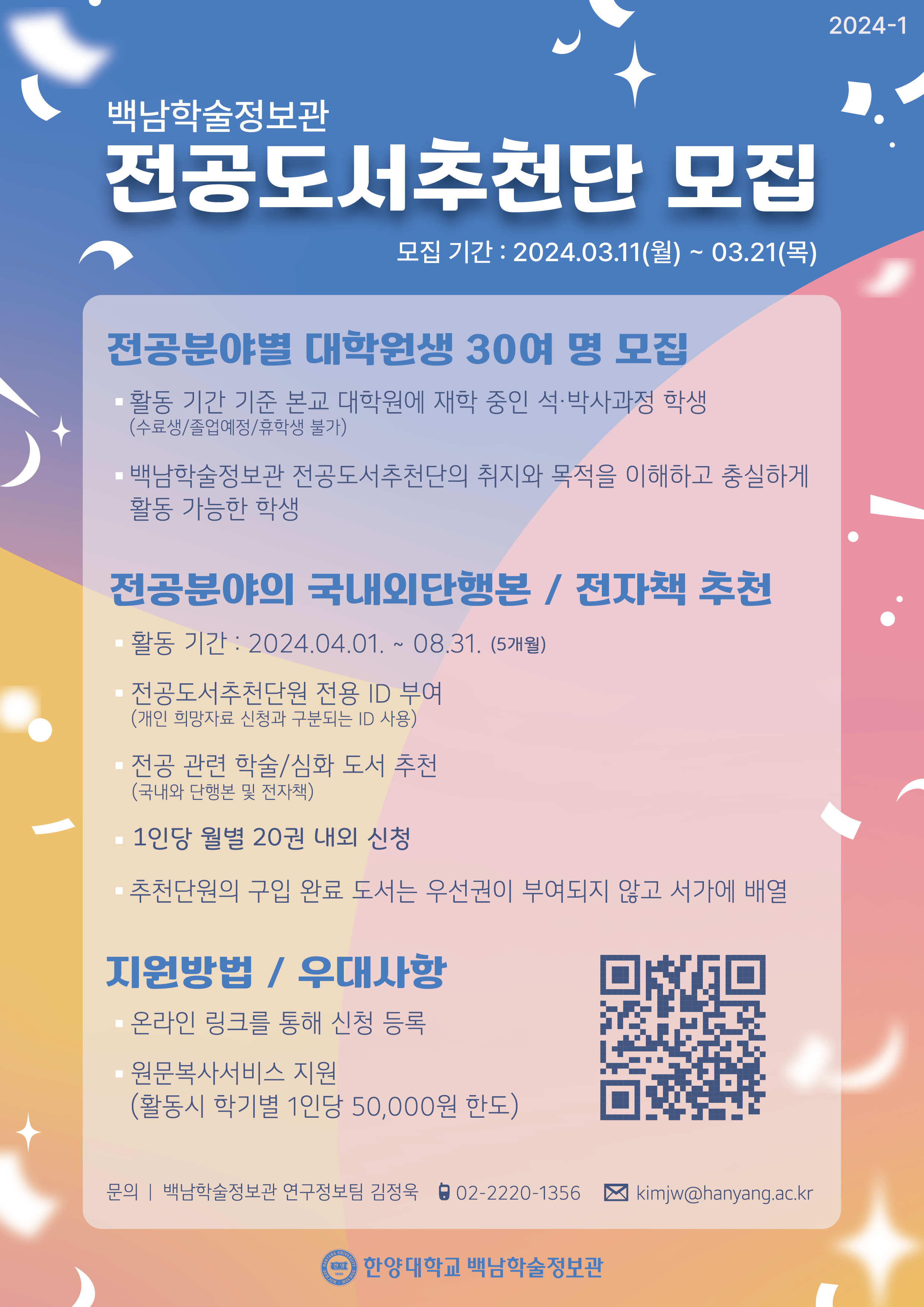 붙임 1. 백남학술정보관 전공도서추천단 포스터(2024-1)