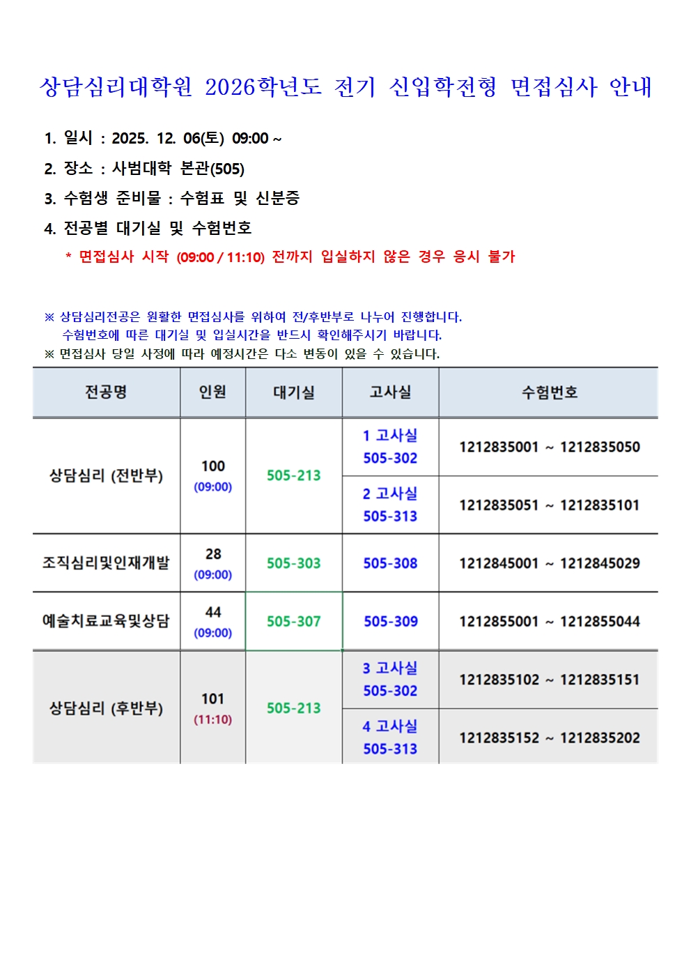 [입학] 상담심리대학원 2026학년도 전기 신입학전형 면접심사 안내