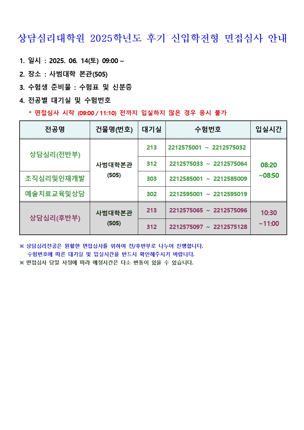 상담심리대학원 2025학년도 후기 신입학전형 면접심사 안내