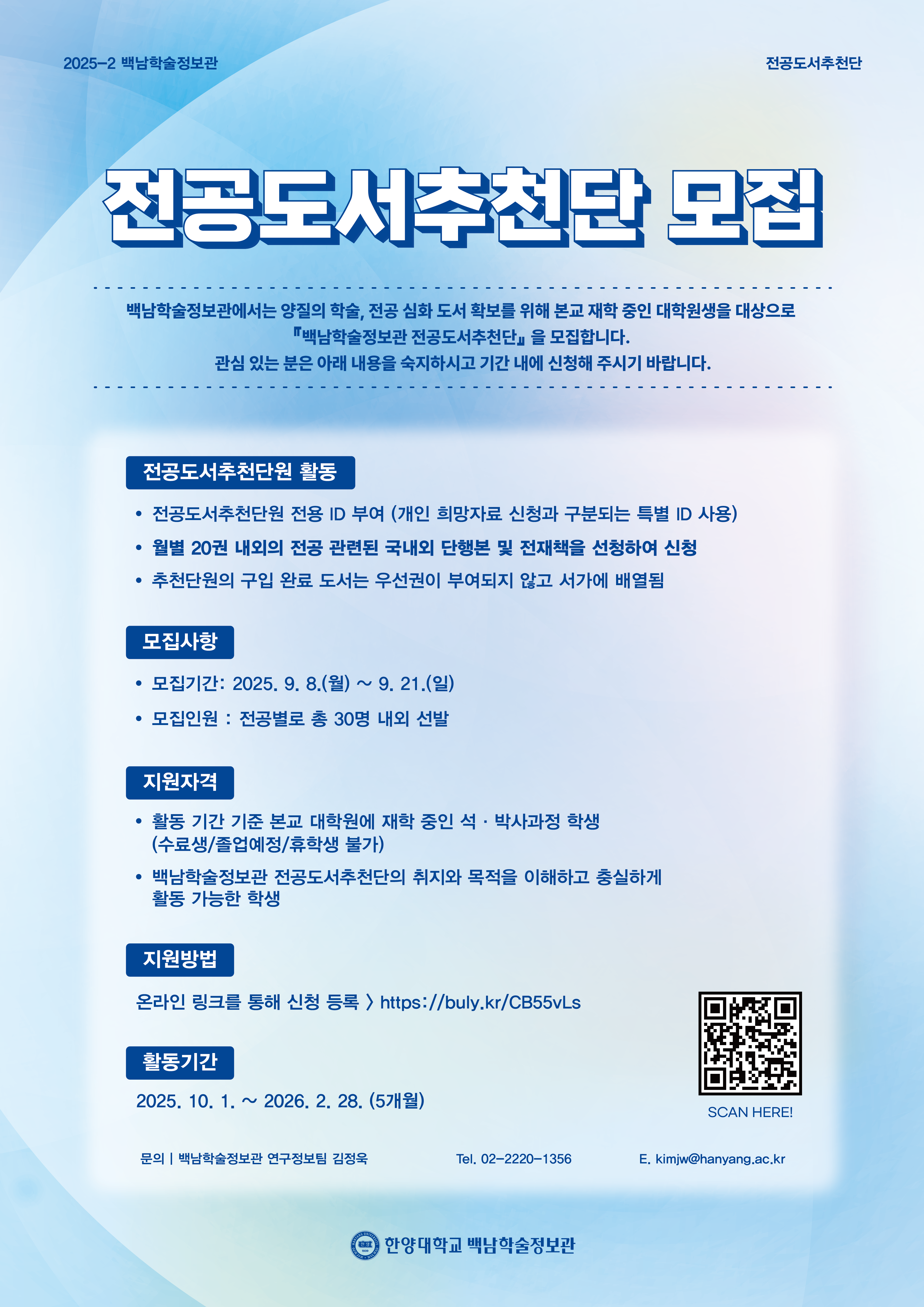 백남학술정보관에서는 양질의 전공 도서 확보 및 희망자료 신청 활성화를 목적으로 본교 대학원생으로 구성된 ‘백남학술정보관 전공도서추천단’을 모집합니다. 소속 대학원생들이 참여할 수 있도록 홍보하여 주시기 바랍니다.